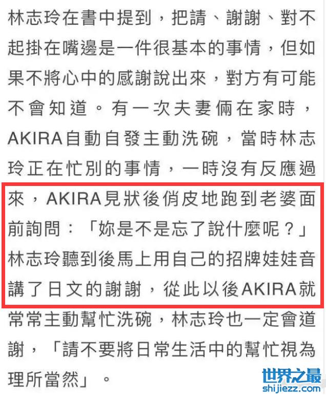 此外,林志玲在婚后生活中时常都会负责家务活,偶尔丈夫AKIRA会帮忙洗碗,但有一次林志玲在忙别的事,AKIRA洗完碗后问她是不是忘了什么,林志玲赶忙用日语说谢谢。