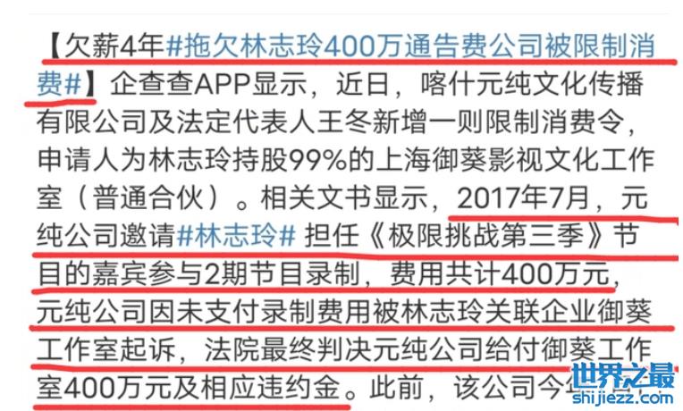 之前,林志玲还被曝出向《极限挑战》讨薪,她作为飞行嘉宾录了两期节目,通告费就高达400万。