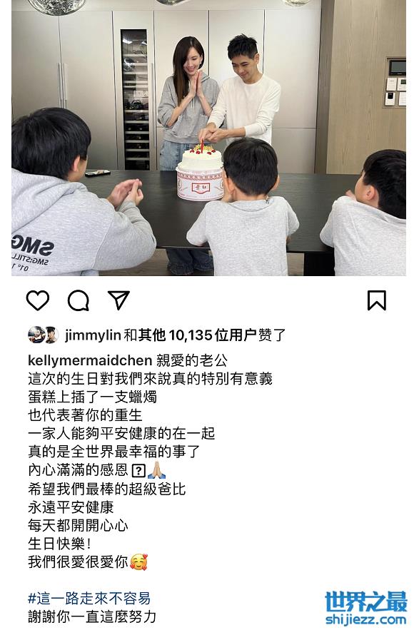 在林志颖发布庆生动态后,陈若仪也发文送了祝福:“亲爱的老公,这次生日对我们来说真的特别有意义,蛋糕上插了一支蜡烛,代表着你的重生,一家人能够平安健康在一起,真的是全世界最幸福的事了,内心满满的感恩,希望我们最棒的超级爸比,永远平安健康,每天都开开心心生日快乐,谢谢你一直这么努力。”