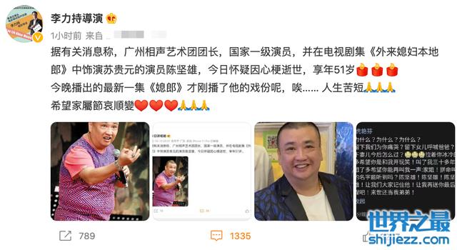 10月15日,李力持导演在社交平台发布消息,称据有关消息得知演员陈坚雄疑似因突发心梗逝世,享年51岁,引发全网热议。