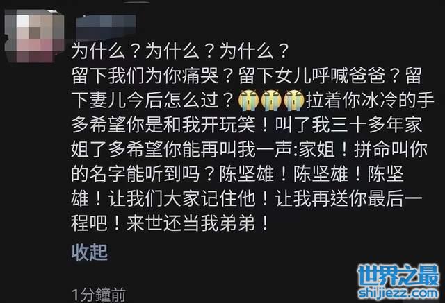 随后,陈坚雄姐姐的朋友圈截图也疑似流露出来,她发文表示陈坚雄已经撒手人寰,留下妻女痛哭流涕,字里行间充满着失去亲人的悲痛之情。