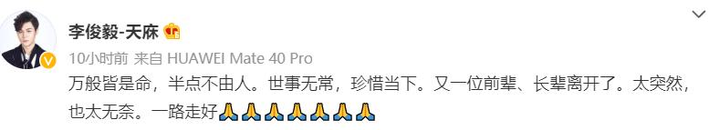 《外来媳妇本地郎》饰演“二嫂儿子康天庥”的李俊毅也悲痛发文,世事无常,珍惜当下,又一位前辈、长辈离开了,太突然,也太无奈,一路走好。