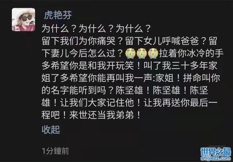 其实虎艳芬在得知陈坚雄去世后,在朋友圈也发布了动态,她悲痛连问几个为什么,她多么希望这是个玩笑,也希望大家都能够记住他,送他最后一程。