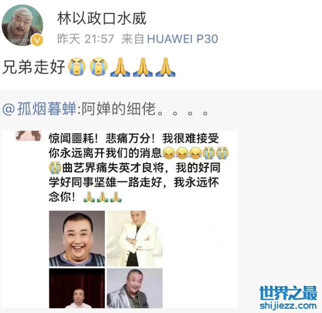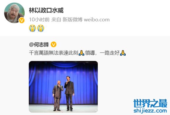 《外地媳妇本地郎》“口水威”饰演者林以政也送别好兄弟,据悉,林以政还曾出演了《倚天屠龙记》《射雕英雄传》等影视作品,得知好兄弟去世的消息他转发了两条动态,连发多个大哭的表情。