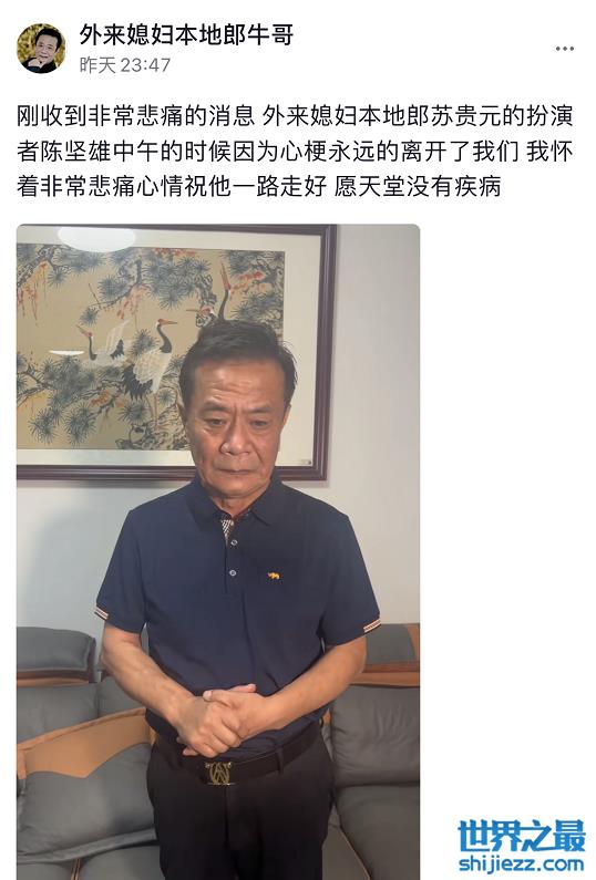 《外来媳妇本地郎》“牛哥”扮演者李卫东也悲痛发文,他告知陈坚雄是在中午的时候因为心梗离开了,而当时他正在直播,得知去世的消息后他不相信,而后他琢磨不可能有人拿这个事开玩笑,便停掉了直播。