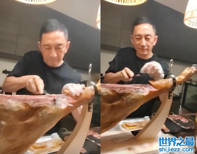 而旁边的吴启华就显得格外安静了,穿着一件黑色短袖,露出紧实的手臂肌肉线条,手上戴着一次性手套正在用刀一片一片切着昂贵的金华火腿,神情十分专注,看上去颇有一番儒雅气息。虽然吴启华打扮简单朴素,但依旧掩盖不住他身上散发出来的独特气质,不失当年风采。