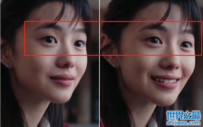 遮住刘浩存的下半张脸,你会发现,她笑与不笑时,眼神都没有丝毫变化,都很空洞。