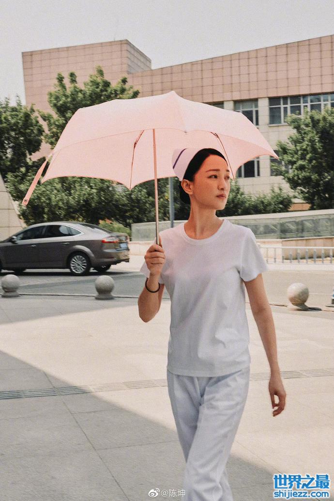 还有两张打着伞的生活照,周迅坐在花草丛中眺望远方,文艺范十足,还有打伞走在路上的护士造型,侧脸可谓相当优越。