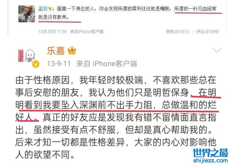 此外,乐嘉的点评,经常被说一针见血,而孟非发文称一针见血其实是没有教养,疑似在内涵乐嘉。乐嘉也发文说不喜欢假好人,似乎在回怼。加上两人没有互关互动,于是越来越多人认为他们“决裂”了。