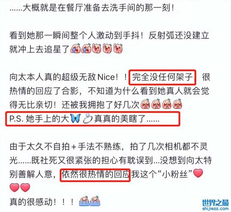 在拍摄者的文案中写道,此次偶遇向太的地点其实是在去往餐厅的路上,因为过于突然,作为粉丝的她当时表现得很紧张,但向太却没有丝毫的不耐烦,全程都很热情的回应了她的喜欢,不仅配合她的合照,甚至还多次与她拥抱,整个过程中向太表现得非常亲切毫无架子。