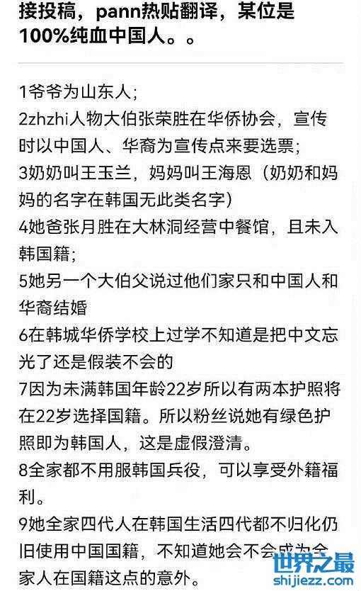 目前张元英还没满22周岁,所以是双国籍。尤其是她们全家都不用服役,张元英的妈妈姓王,大伯还有张元英都上了“韩国华侨名人榜”。