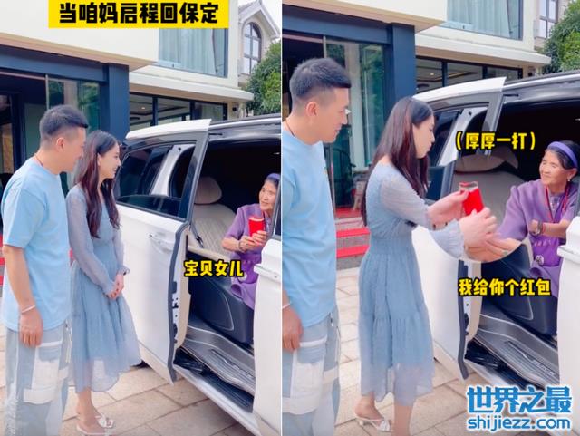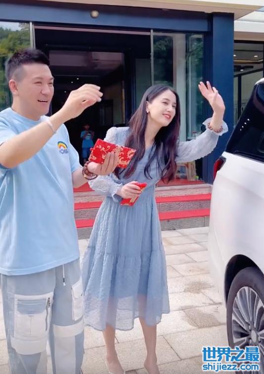 从视频中可以看到,黄圣依穿着蓝色连衣裙打扮淑女和老公站在一起与即将启程回保定的婆婆挥手告别。随后,婆婆面带笑容就从包里拿出一个大红包交给黄圣依,口中还说着“宝贝女儿,我给你个红包,”能看出黄圣依与婆婆的关系十分和睦。