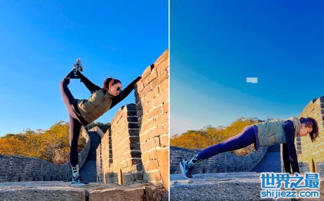 能看出吕一的柔韧性特别好,每套动作她都能很好地掌握并且做的十分标准。其中一张照片中只见她一只手搭在长城城墙上,右腿腾空而起,另外一只手拉着右腿,左腿笔直地站着,整个人重心往下移,动作保持得非常平稳。又或者是双手撑地,做出俯卧撑一样的动作,不得不感叹吕一的体能是真的好,一连套动作看上去十分丝滑。