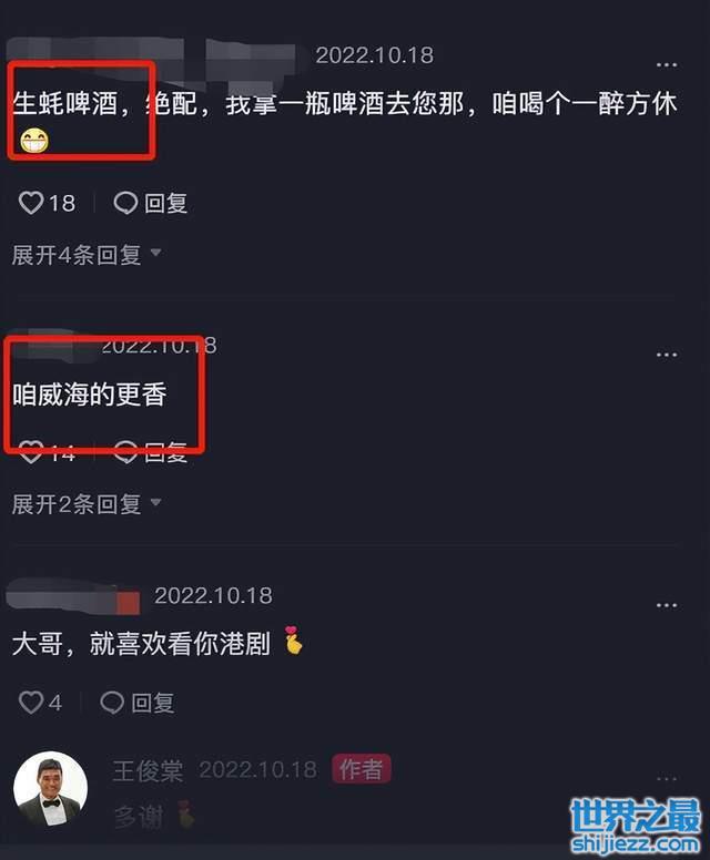 评论区的网友们也是炸开了锅,不乏热评第一的社牛直言要带着啤酒去找王俊棠喝上一杯,更有人喊话王俊棠表示他家乡威海的生蚝也很好吃,估计是王俊棠的威海老乡吧。更有人是王俊棠的剧粉,直言喜欢看王俊棠演港剧,而王俊棠也对网友的喜欢表达了感谢。