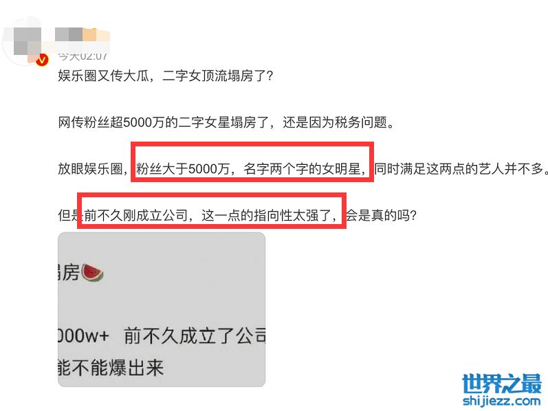 从这条爆料来看,这位二字女顶流拥有5000多万粉丝,而且前不久刚成立了公司。爆料还称目前该女星正在补缴中,看后续是不是会爆出来。网友们根据5000万粉丝及最近刚开公司这两条线索,将二字女顶流锁定在了杨幂、杨颖、杨紫和谢娜这四位。