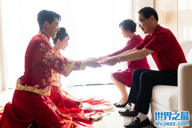 在室内环节,这对新人身穿中国传统婚服,透露着大气的美丽。画面中可以看到张檬和金恩圣向张檬的父母跪下敬茶,他们脸上洋溢着幸福的喜悦,而张檬的父母也向这对新人发放改口的红包。