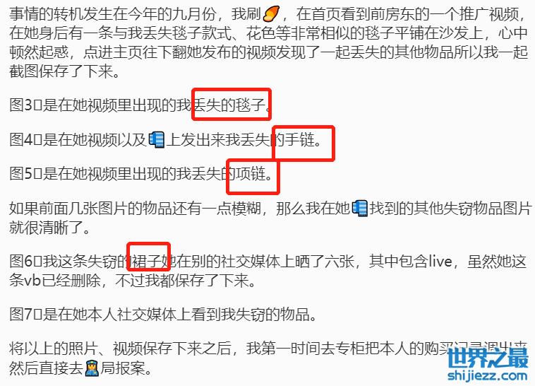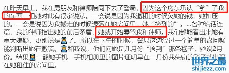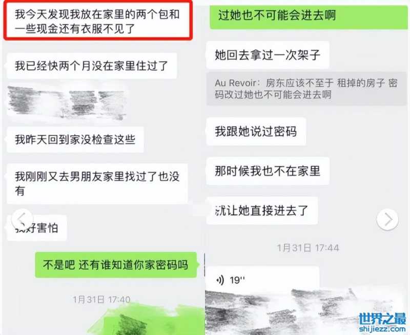 在一开始,网友本人其实也并不确定是否被盗,只是和自己朋友在聊天时透露过,自己不在家的两个月时间里,房东曾进入过自己家,等自己回家时家里的一些包包衣服和现金都不见了,但她并不能确定这些物品就是被网红房东所盗窃。