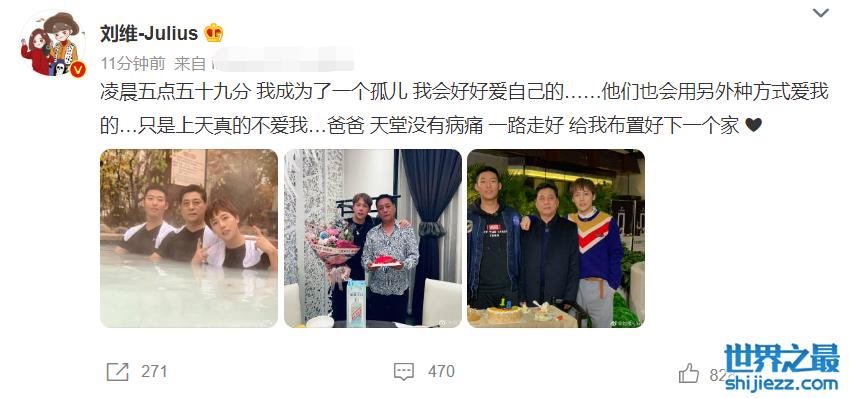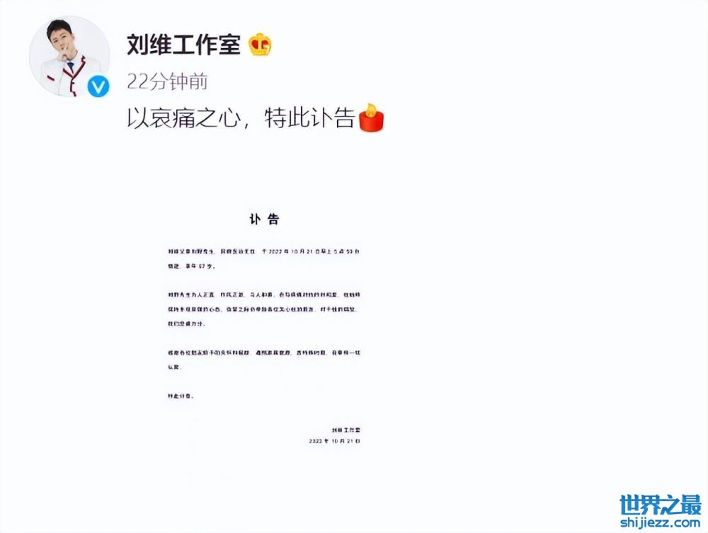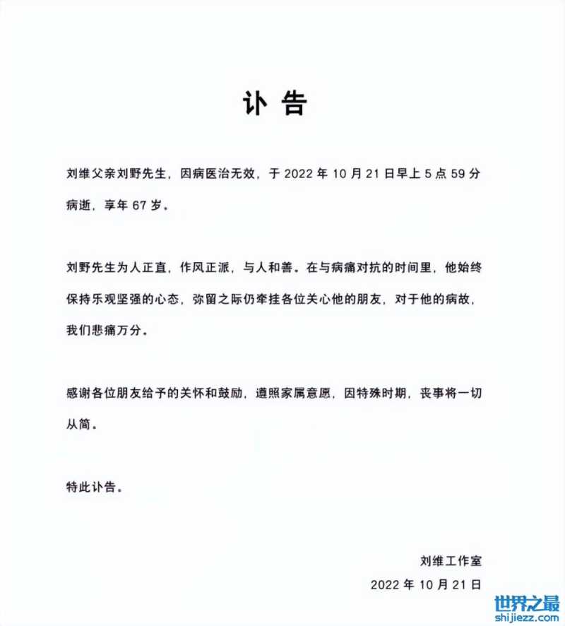 刘维的工作室也在第一时间向大家宣布了这个不幸的消息,证实刘维爸爸去世的消息。