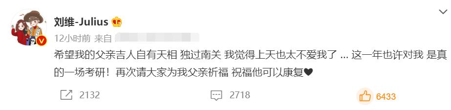 在12个小时前,刘维还曾在社交平台上发文为自己的爸爸祈福,他希望爸爸可以顺利度过这一个劫难,也希望喜欢自己的网友们能和自己一起为他的父亲祈祷,祝愿他的爸爸能早日康复,没有想到短短几个小时后,厄运还是降临在了刘维身上。