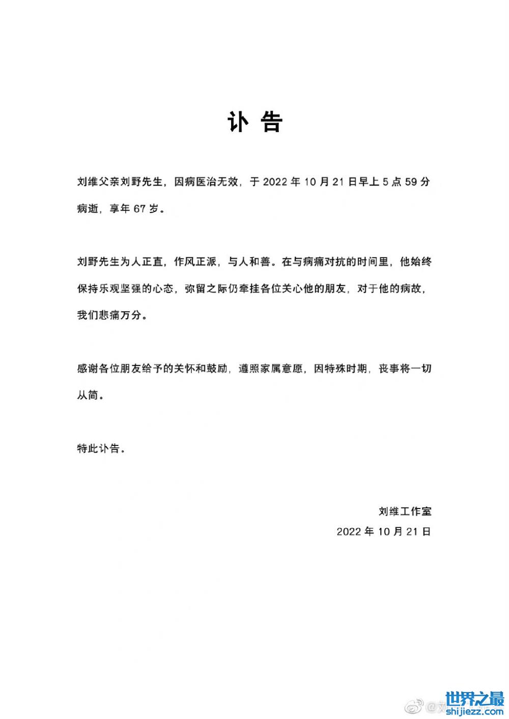 刘维工作室也对外发布了讣告,直言刘维爸爸刘野为人正直,与人和善,在与病魔对抗的时间里,始终保持乐观坚强的心态,也感谢各位朋友给予的关怀与鼓励,尊重家属意愿,丧事一切从简。
