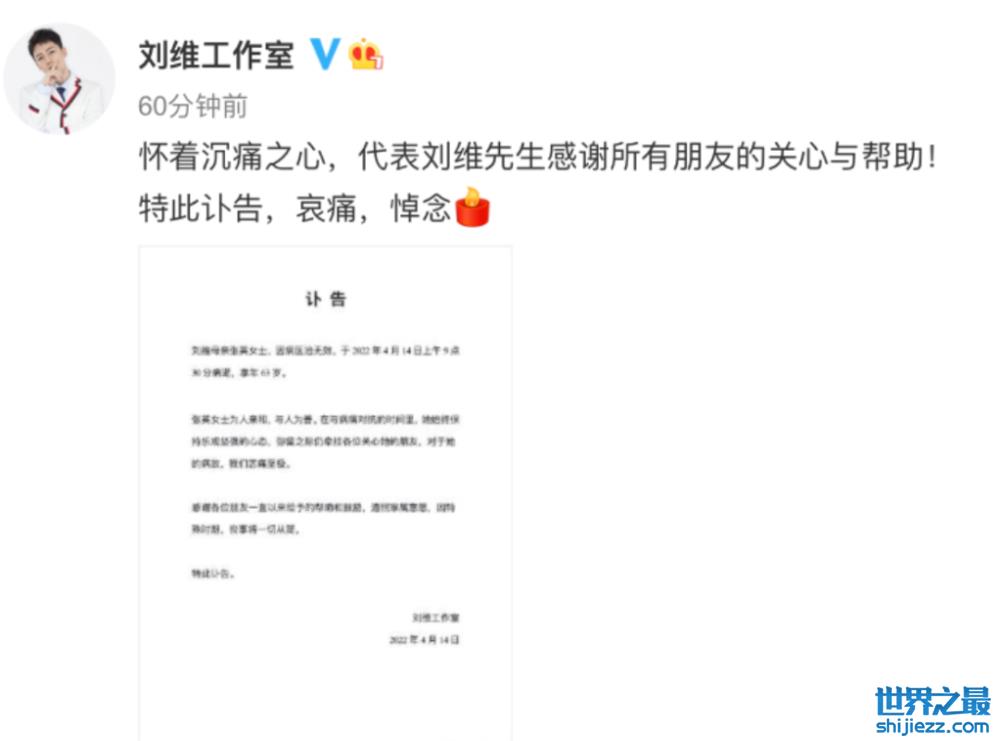 但是4月份,刘维工作室发布讣告,妈妈因病去世。消息沉痛,刘维的孝心也打动了无数网友。