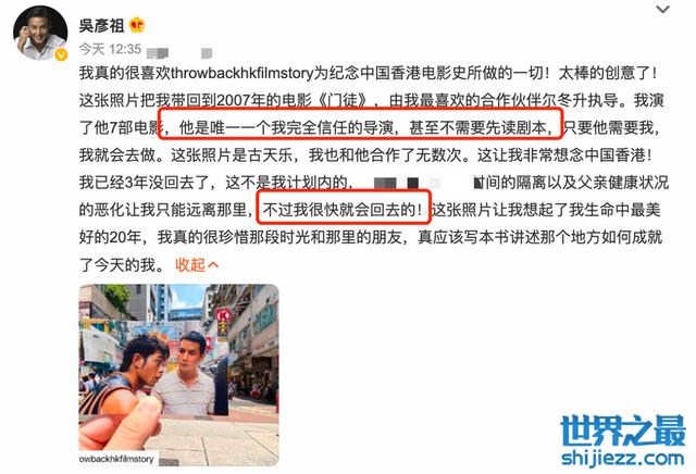除了吴君如,好友吴彦祖也是在个人账号中特意发文为古天乐庆祝,并附上两人合作的旧照。虽然在文中没有明显提及到生日,但配文“这张照片让我想起了我生命中最美好的20年,我真的很珍惜那段时光和那里的朋友。”这一段话,就已经表达了两人之间深厚的情谊。
