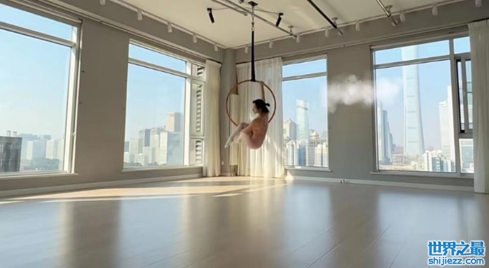 正在进行空中瑜伽的柳岩格外迷人且吸睛,她时而坐在纤细上的吊环上跟随着它的节奏感缓慢转圈,时而借助吊环的力量将半个身体都悬空在外,做着一些舒展放松的动作。