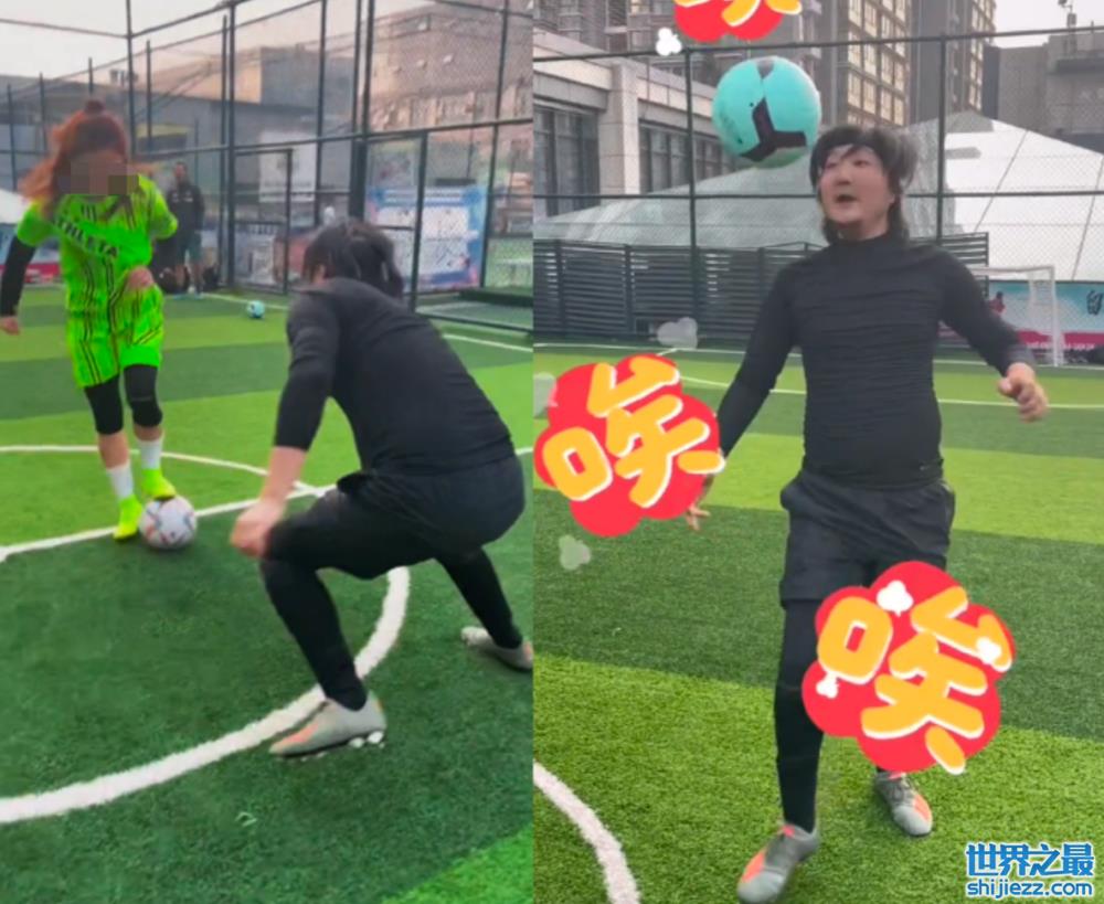 王大治和美女教练踢足球,一脸络腮胡子显油腻,头发泛白黑眼圈重 ...