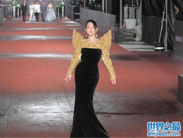 很明显,S姐凹造型凹得很辛苦,感觉脖子和胳膊都在尽力拉伸,还是无法从这条“金元宝”礼服裙里舒展出来。