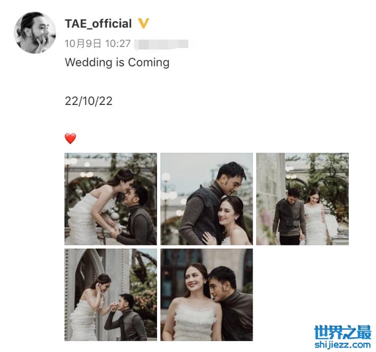 在今年10月初时,TAE就大方晒出两人的婚纱写真,当时不少网友赞新娘子长得大气美艳、颜值不输明星。