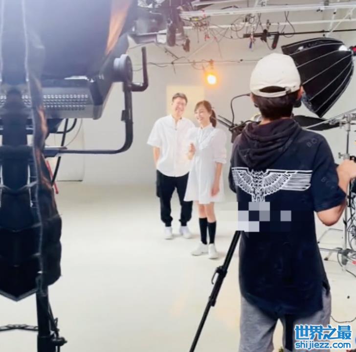 录制完采访时,两人站在一块应该在拍合体宣传照,被众多摄影摄像的设备围绕着。只见于震老师双手插兜十分帅气,深情地看着站在自己面前的老婆,而辛月笑靥如花十分开心,画面幸福美好,恬静淡然。