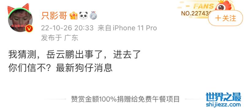 10月26日,拥有500万粉丝的大V在网络上爆料:我猜测,岳云鹏出事了,进去了。