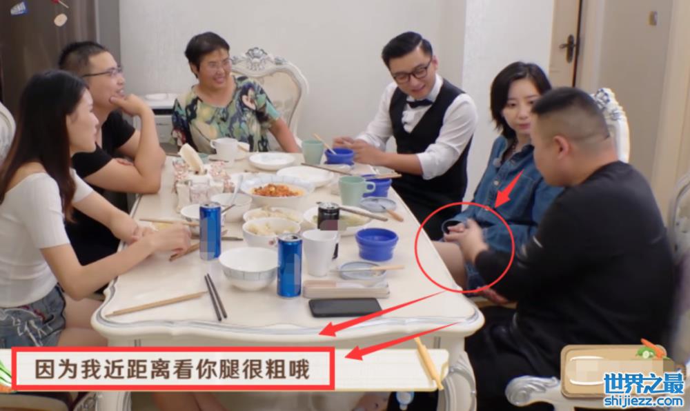 他对李斯丹妮说:近距离看你的腿好粗啊,而且你还没脚脖子。而李斯丹妮非常尴尬,一边笑一边蹲下捂住自己的腿。