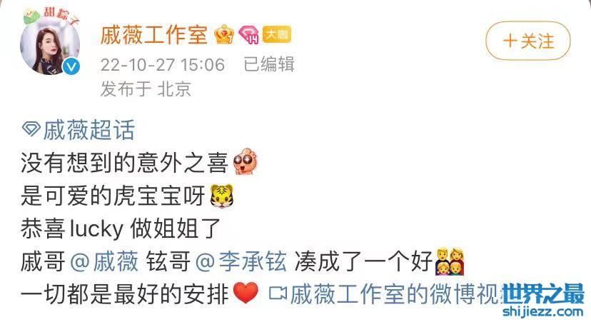 而随后戚薇工作室也正式官宣她顺利生下二胎,并配文写道:“没有想到的意外之喜,是可爱的虎宝宝呀”,还恭喜lucky做姐姐了。