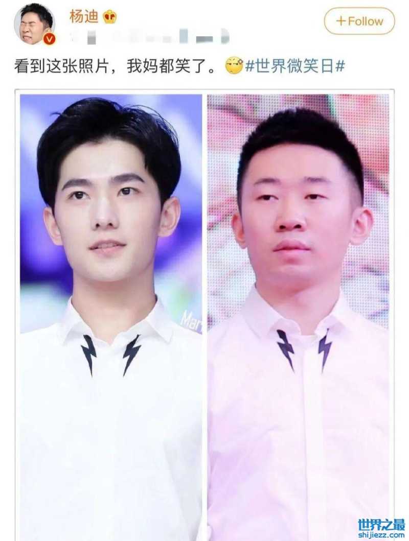 有一次,杨迪发动态称,“我妈都笑了”,配的是他和杨洋穿同款白衬衫的图片,前后对比实在太强烈。