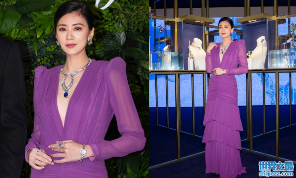 当日贾静雯穿着一袭紫色薄纱深V长裙明艳动人,皮肤白皙紧致身材匀称,完全看不出是已经生了三个娃年龄有48岁的女性。当晚贾静雯浑身上下戴满了奢侈珠宝,比如脖子上的超大宝石项链,手上镶满钻石超闪耀的手表和钻戒,整个人就是贵气逼人。