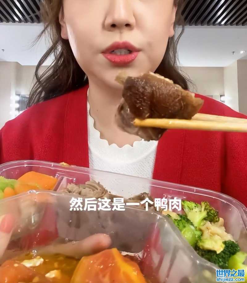 而且关凌还特意展示自己盒饭中的唯一荤菜,虽然整体对比来看肉类的分量不算特别多,但不得不夸一句这巨大一块的鸭肉真的很实在。