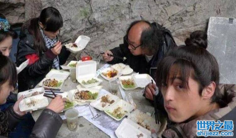 而且有桌子和凳子就算条件不错,很多时候明星们甚至连张像样的餐桌都找不到,随手抓几张废纸就能拿来当作餐垫。就比如曾经胡歌在拍摄《仙剑》时,就是和剧组工作人员坐在一起狼吞虎咽,当时刘诗诗也同样抱着饭盒坐在一旁。