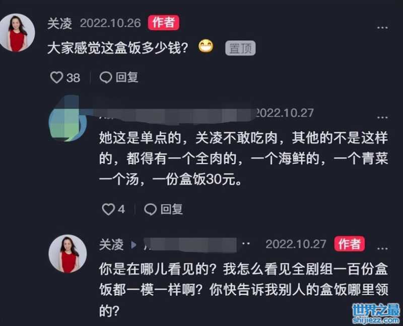 有网友在评论区表示真正的央视盒饭并不是这样,关凌这是自己单点的。于是关凌也在第一时间给出了回应,她表示整个剧组一百份盒饭都是一模一样的,不存在明星搞特殊的情况,她不希望网友的发言引起不好的谣言。