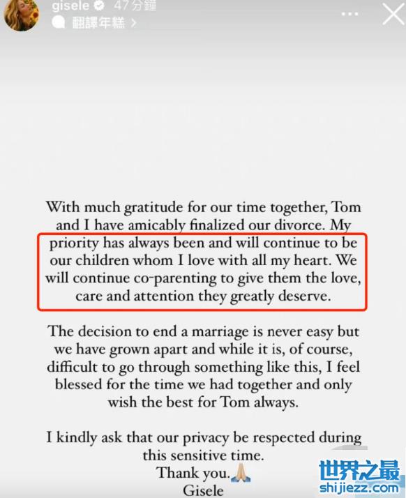 随后名模吉赛尔·邦辰也发布离婚声明,祝福前夫布雷迪今后一切顺利,并表示会全力爱护两个孩子,共同抚养他们,给他们更多的爱与关心。