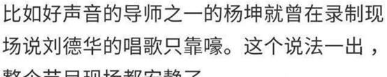 十多年后,杨坤又在担任《好声音》导师期间点评过刘德华,将之当做反面教材:“刘德华唱歌全靠吼,唱功也不好,根本不配叫天王。”