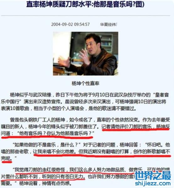 远在2004年那会儿,杨坤就曾言论大胆地公开评论过刀郎的音乐:“刀郎有音乐吗?……我觉得刀郎走红很奇怪,我们这么多人努力地做品质、做音乐,可在他的唱片里什么都听不到,听到的只有苍白无力。”