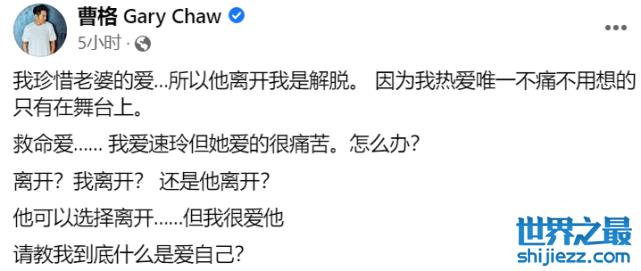 最后曹格还表示自己一直深爱妻子吴速玲,离开不是因为不爱,而是因为太爱,还连问网友自己要不要离开,在是否决意要离开的选择上可以看出曹格内心很是矛盾,为此甚至半夜失眠,听歌听到哭,还反问网友自己到底做错了什么?