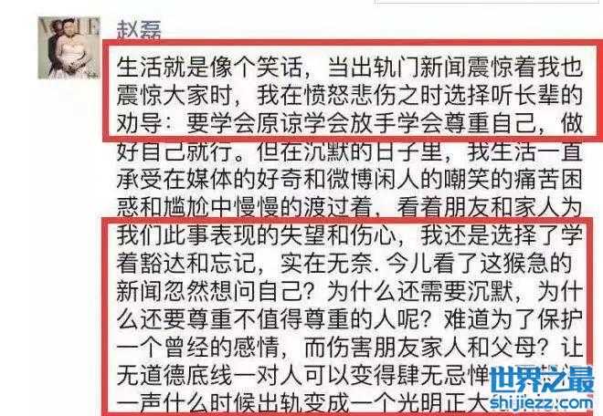 消息曝光之后,赵磊却站出来说两个人当时还未离婚,看到新闻的时候心情亦是愤怒且复杂。不过,这个说辞却被秦舒培否认了,并晒出了一定的证据澄清。关于赵磊和秦舒培之间的关系争议还是很多的,事情的真相只有当事人知晓。