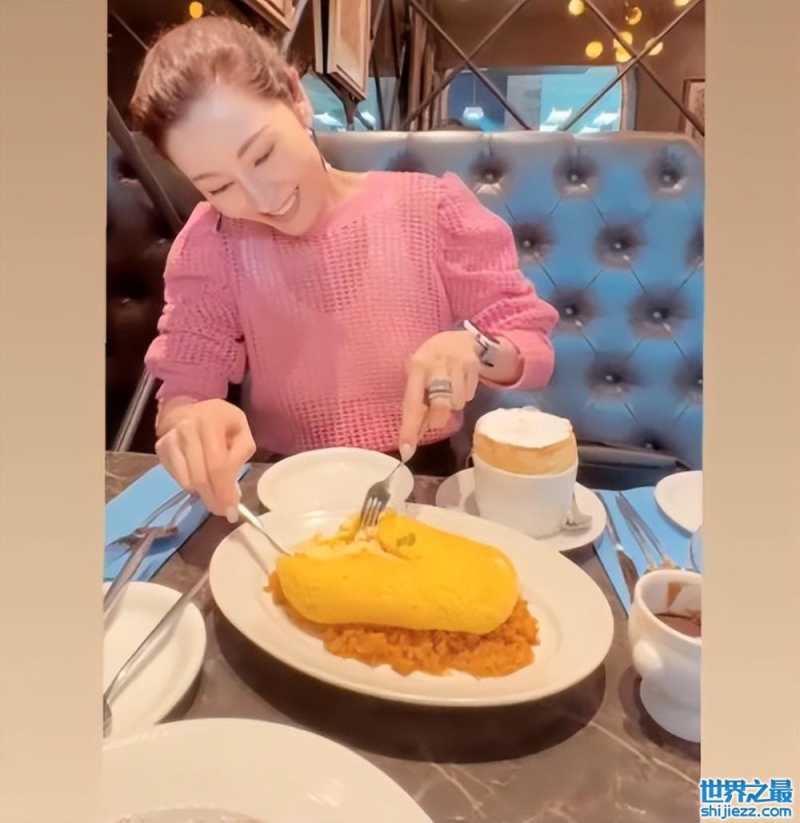 上半身穿着粉色格子衣的她笑着看镜头,然后手上刀叉齐用一起品尝美食。李嘉欣精致的妆容完全看不出已经是52岁的女人。