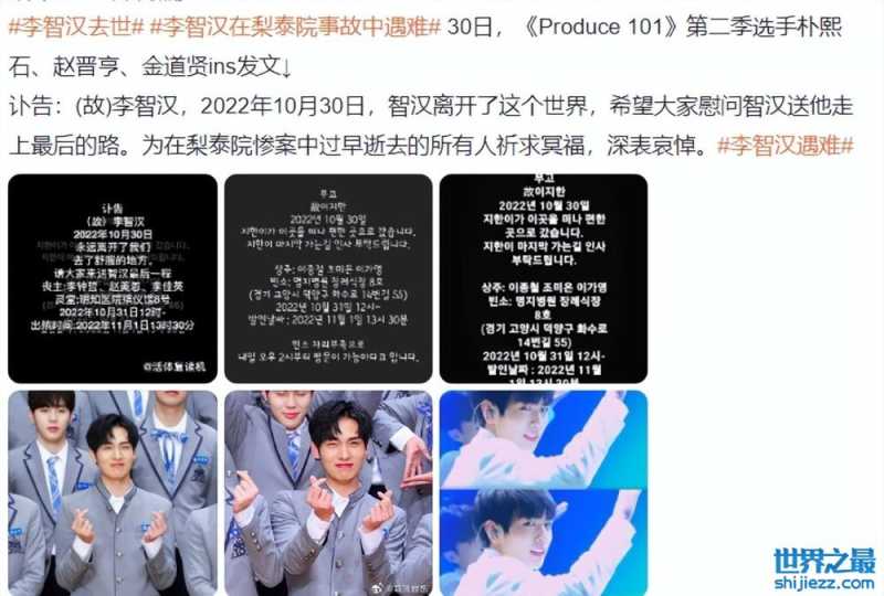 据媒体报道,韩国选秀节目《PRODUCE 101 》第二季选手李智汉,因梨泰院踩踏事故不幸离开了这个世界,年仅24年。
