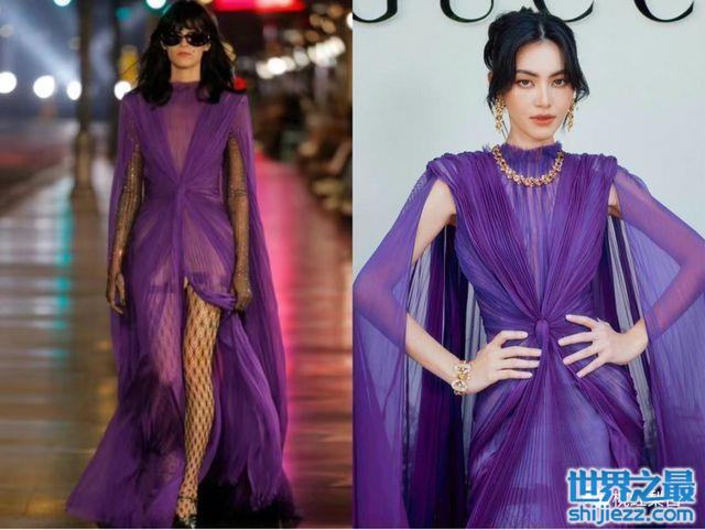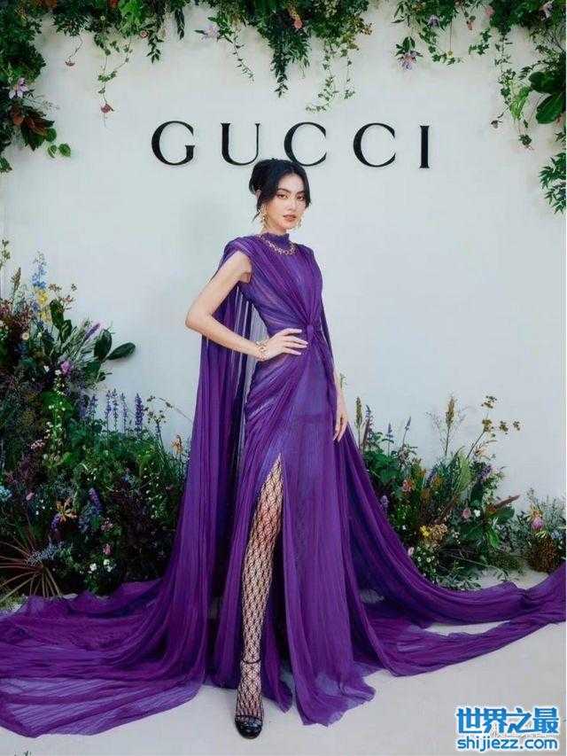 去看最新一季的Gucci大秀,选了秀场上高难度的一条紫色礼服裙上身,但也被她稳稳地压住了,配上她一贯的浓烈混血颜,整个人又美又妖,简直就是大写的摇曳生姿。