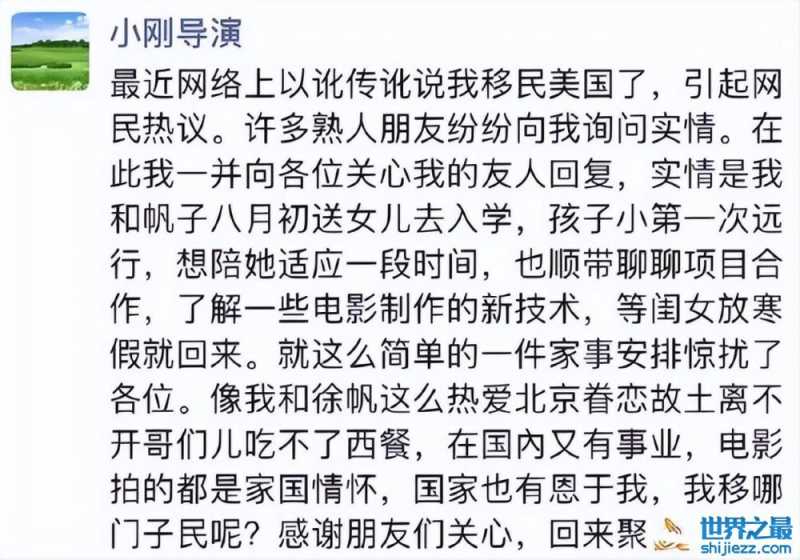 冯小刚发文回应移民:国家有恩于我,寒假就会回北京!