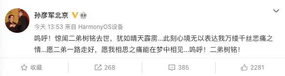 据好友透露,陆树铭是因为突发心梗不幸去世,而在他去世之前的两天,他还发布了动态并更新了朋友圈,他最后一次露面是在10月16日,当时他晒出了很多旧照合影,他直言感谢生命的每一个瞬间。
