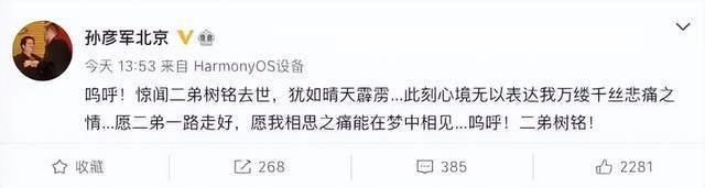 听闻陆树铭去世的噩耗,很多圈内人士都纷纷发文表示悼念,《三国演义》“孙权”的饰演者吴晓东也发布动态,表示自己难以相信挚友离世的消息,内心也是悲痛至极,最后,吴晓东还不忘呼唤陆树铭的昵称“大陆”,希望兄弟可以一路走好。